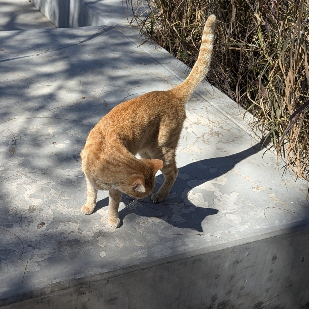 (Look at this adorable orange cat in Mazatlán, Mexico looking at her own shadow!)